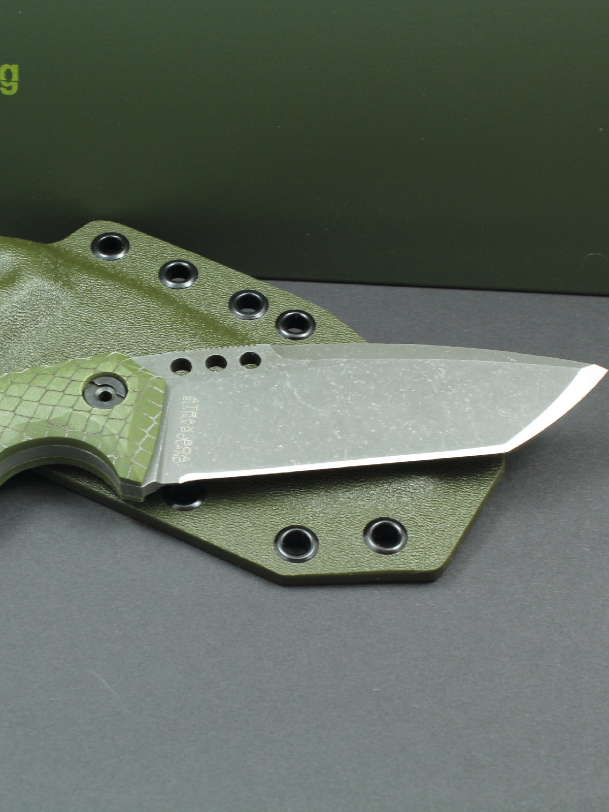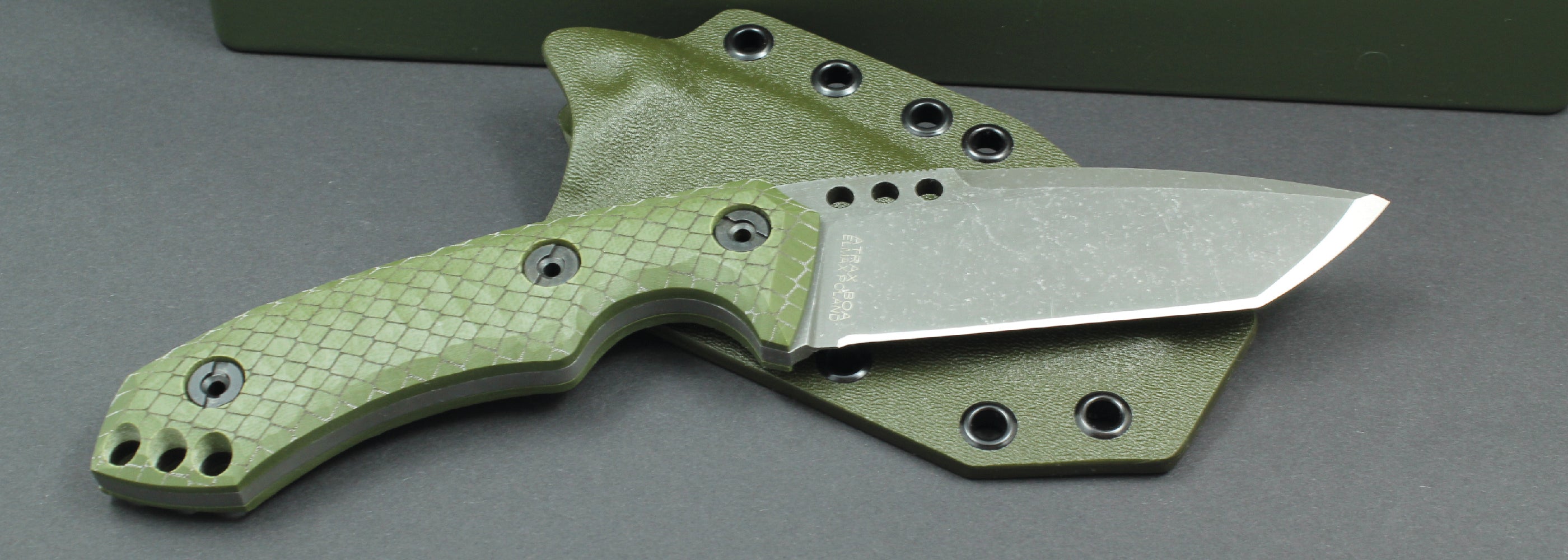 Atrax BOA is an unusual knife due to its shape. A project made together with my friend Plutek from BalckBulldog. It is difficult to attribute it to standard shapes available on the market. It is a mixture of Japanese Tanto and Drop point. It is available in a thickness about 4.4mm (0,173in) and a total length of 230mm (9.05in). It has a cutting blade with a length of 100mm (3.93in). The dimensions of the knife allow it to be worn on combat belts, bulletproof vests, backpacks or in pouches. The handle fits the gripping hand very well. BOA has a small crossguard with a handle.