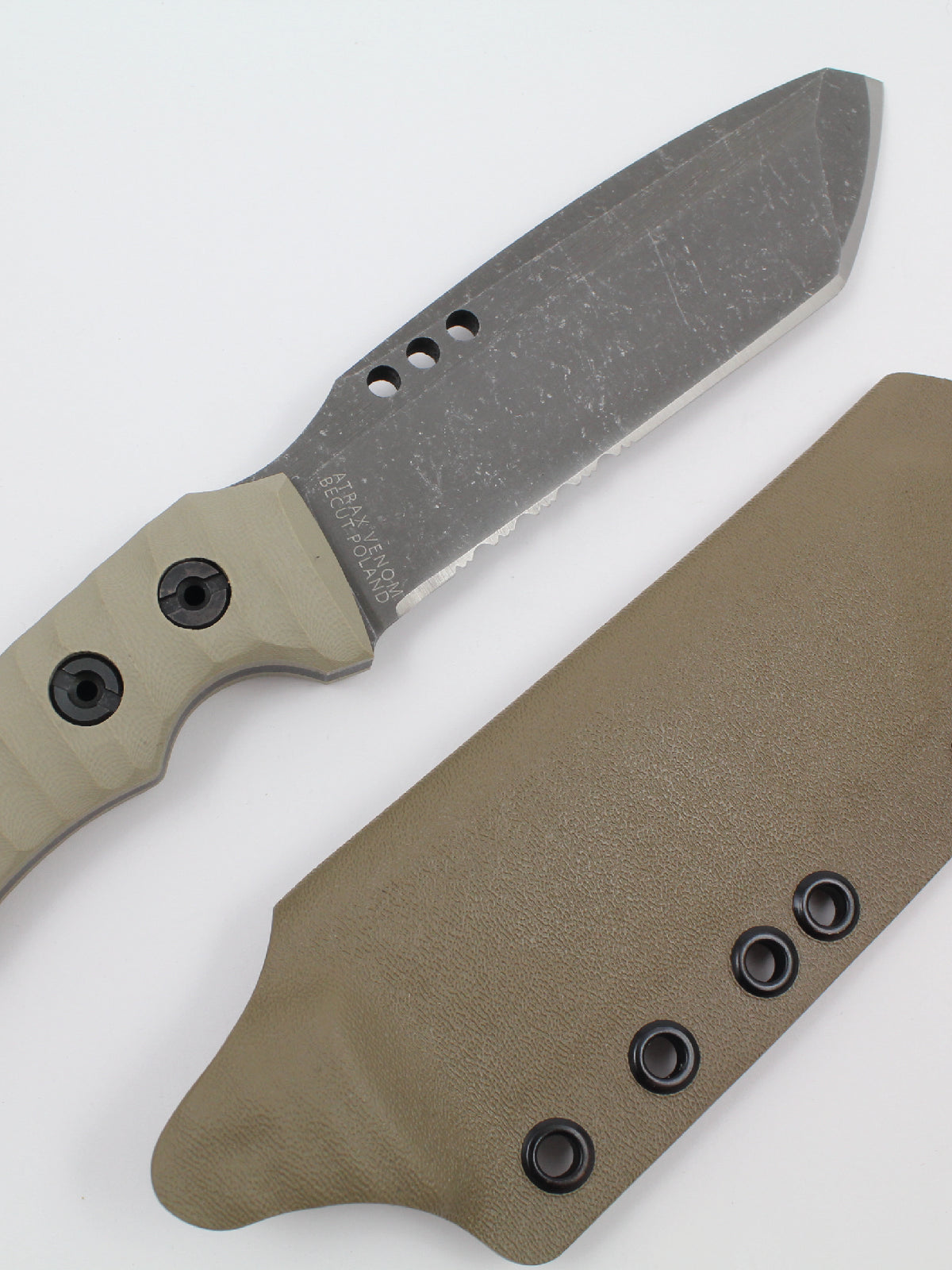 Atrax Venom is a tactical Full Tang military knife designed to be worn on a combat belt or plate carrier. The Tactical series was created to allow knives to be carried openly or concealed. A knife intended for special units performing high-risk tasks and for everyday use. The knife is designed to be as universal as possible in all conditions. You can also easily take it on survival and bushcraft expeditions. To make Venom knives, we use the best steels on the market, such as Elmax, D2, M390 and Becut. The type of steel is selected according to the desired finish of the coating, i.e. black oxide, cerakote, stonewashed or satin. Everything to obtain the best possible quality and durability.