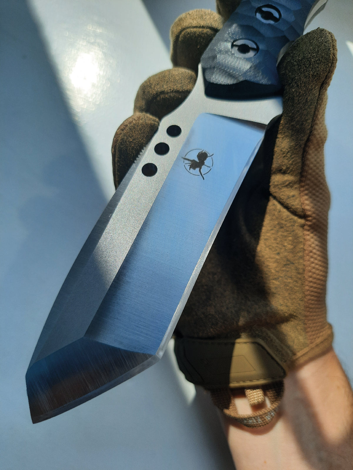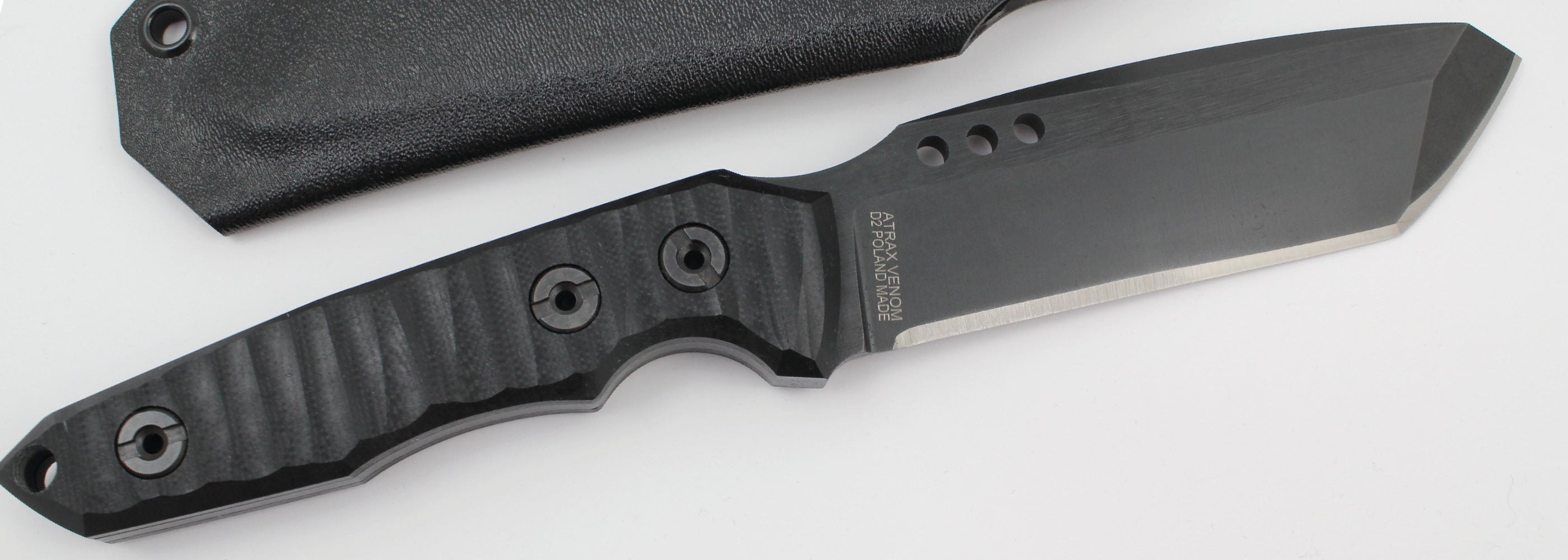 Atrax Venom is an unusual knife due to its shape. It is difficult to attribute it to standard shapes available on the market. It is a mixture of Japanese Tanto, Drop point and Spear point. It comes in thicknesses of 4mm (0.157in), 5mm (0.196in) and 6mm (0.236in) and a total length of 250mm (9.84in). It has a cutting blade with a length of 125mm (4.952in). The dimensions of the knife allow it to be worn on combat belts, bulletproof vests, backpacks or in pouches. The handle fits the gripping hand very well. Venom has a small crossguard with a handle. It has a special recess that facilitates the positioning of the knife in the hand and increases grip.